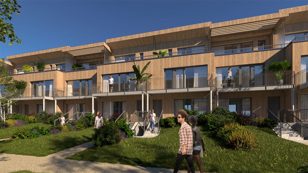 Die Reihenhäuser werden über dem halbgeschossig in das bestehende Niveau gesetzten, offenen Parkdeck errichtet. Die dreigeschossigen Gebäude in Holzbauweise sind über einen allgemeinen Erschließungsweg und über einen großzügigen Privatgarten im ersten Obergeschoss aus betretbar. Die wechselnden Haustypen besitzen jeweils eine großzügige Wohnküche, drei Schlafzimmer, zwei Bäder, sowie Freibereiche in jedem Geschoss. Abstellraum und Haustechnik befinden sich anschließend an das Parkdeck im Erdgeschoss. Von dort gelangt man über eine Privatstiege direkt zum Hauseingang im ersten Obergeschoss.