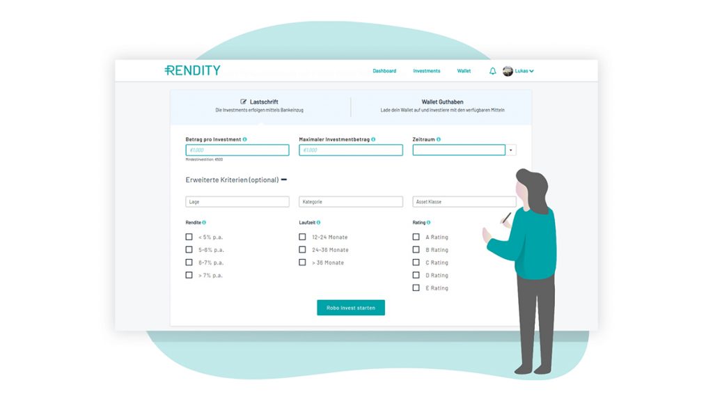 Lege deine persönlichen Präferenzen in unserem Investment-Konfigurator fest, um dein Geld so unkompliziert wie möglich für dich arbeiten zu lassen. Du bestimmst die Höhe deiner Investments und legst individuelle Kriterien wie zum Beispiel Lage, Laufzeit und Rendite fest. Dank unseres intelligenten Algorithmus werden automatisch die für dich passenden Projekte ausgewählt und anhand deines Investmentplans investiert.