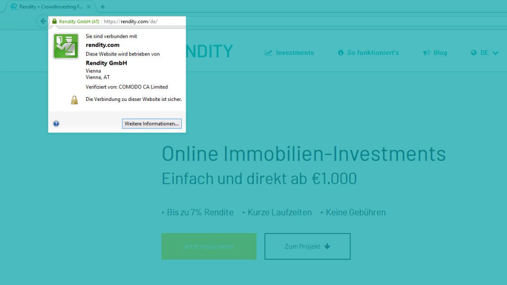 Auch Rendity speichert und transferiert sensible Kundendaten. Zum Beispiel sind wir gesetzlich verpflichtet für jeden Investor ein Anlegerprofil zu erstellen. Die Sicherheit steht dabei an oberster Stelle, da wir die Geheimhaltung der übermittelten Informationen, die Integrität und die Authentizität auf unserer Plattform mit einer TLS/SSL Verschlüsselung gewährleisten. Hierbei handelt es sich um ein hybrides Verschlüsselungsprotokoll zur sicheren Online-Datenübertragung, welches der De-facto-Standard im Internet darstellt und unter anderem beim E-Banking großer Banken zum Einsatz kommt. Das bedeutet, dass man mit unseren Servern nicht über eine normale HTTP-Verbindung, sondern über eine gesicherte HTTPS-Verbindung kommuniziert, wie man anhand des Sicherheitsschlosses der im Browser angezeigt wird erkennen kann.