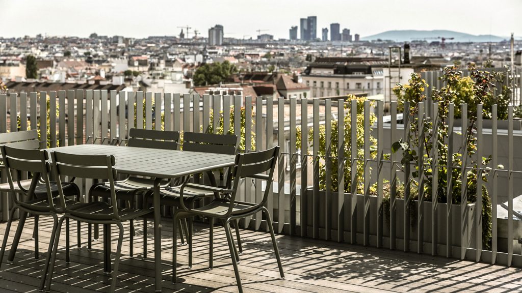 Eine absolute Besonderheit des TELEGRAF 7 ist zum einen die Dachterrasse mit einem phänomenalen Blick über die Dächer Wiens, und zum anderen die eigene, integrierte Hotelsuite. Alle Mieter können diese kostenlos nutzen, etwa zur exklusiven Unterbringung auswärtiger Kunden.