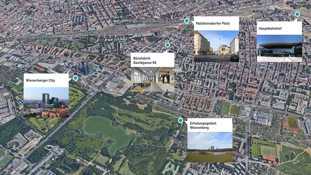 Die Bürofabrik ist öffentlich mit der Straßenbahnlinie „1“ sehr gut an das öffentliche Verkehrsnetz angebunden. In einigen Jahren eröffnet in ca. 100 Metern Entfernung die U2-Station „Gussriegelstraße“, mit der man innerhalb weniger Stationen das Stadtzentrum erreichen wird. In der unmittelbaren Umgebung befinden sich Einkaufsgeschäfte und auch das kulinarische Angebot für die Mittagspause für Nutzer des CoWorking Spaces kommt nicht zu kurz. In den letzten Jahren haben im Übrigen die folgenden Hotspots für starkes Wachstum für den gesamten Bezirk gesorgt und somit viele Arbeitsplätze und Nachfrage für Büroimmobilien, wie auch auch CoWorking Spaces, geschaffen.