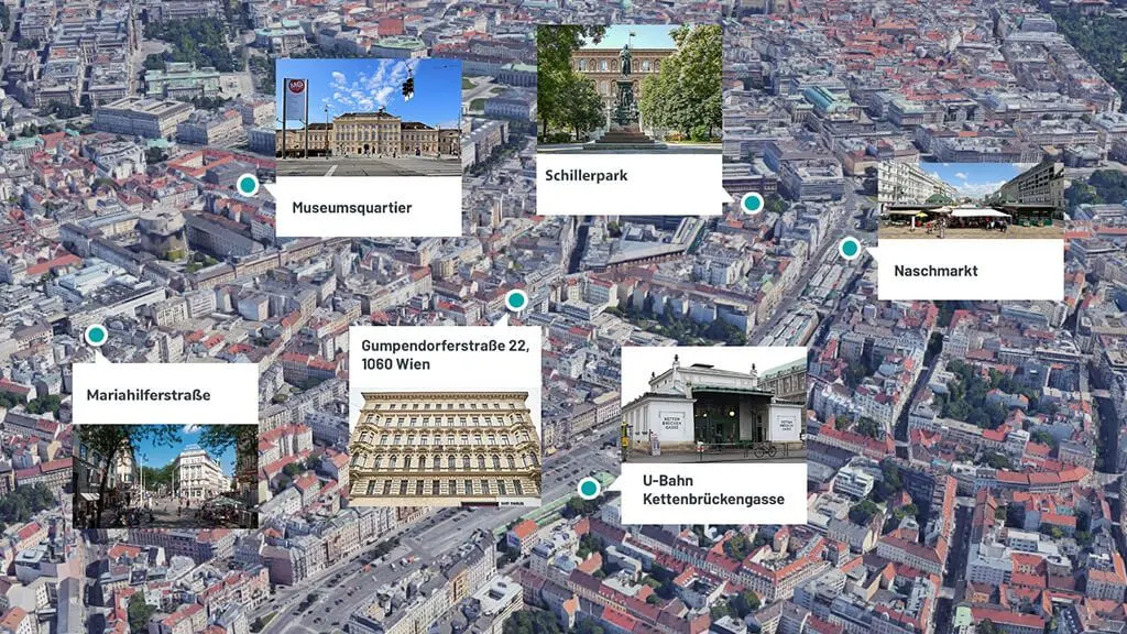 Das Objekt „Gumpendorfer Straße 22“ ist umgeben von allen wichtigen Annehmlichkeiten des täglichen Bedarfs und ist aufgrund der Nähe zum Verkehrsknotenpunkt Karlsplatz (U-Bahn-Linien, Badnerbahn, öffentlicher Nahverkehr) ausgezeichnet an das öffentliche Verkehrsnetz angebunden. Zu Fuß ist man in wenigen Minuten im Stadtzentrum von Wien und gleichzeitig auch schnell in Grünanlagen wie dem Wiener Resselpark, Schillerpark, Volksgarten, Burggarten und dem Stadtpark.