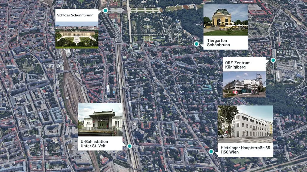 Mit der Entscheidung das Schloss Schönbrunn zur sommerlichen Kaiserresidenz zu machen entwickelte sich Hietzing vom Vorort zu einem Nobelbezirk. Noch heute besticht der Bezirk durch eine hohe Wohnqualität und dem höchsten Grünflächenanteil der Stadt. Alleine das öffentlich zugängliche Areal des Lainzer Tiergartens mit 22,6 km² nimmt rund 60% des Bezirks ein. Hietzing unterteilt sich in: Alt-Hietzing, Unter-St.-Veit. Ober-St.-Veit, Hacking, Lainz und Speising. All diese Stadtteile haben einen eigenen Charme und Besonderheiten. Die Einwohner schätzen den überdurchschnittlich guten Zugang zu Bildungseinrichtungen, die Anbindung an das Stadtzentrum und die weitläufigen Parkanlagen vor der Haustür. Eingebettet in dieses familienfreundliche Ambiente entsteht neuer Wohnraum in der Hietzinger Hauptstraße 65. Die Nähe zu Naherholungsgebieten wie etwa dem Schloss Schönbrunn oder dem Lainzer Tiergarten führt dazu, dass man an diesem Standort sowohl die Ruhe und Geborgenheit einer grünen Wohngegend als auch die Annehmlichkeiten eines modernen Stadtteils mit umfangreichen sozialen, pädagogischen, kulturellen und sportlichen Einrichtungen sowie diversen Möglichkeiten der Nahversorgung genießen kann. Die Anbindung an das öffentliche Verkehrsnetz ist durch die U-Bahn-Station Unter St. Veit und Straßenbahnlinien ebenso gegeben. Innerhalb von rund 20 Minuten gelangt man etwa mit der U4 direkt ins Stadtzentrum. In wenigen Minuten ist man zudem im Einkaufszentrum Hietzing, dem kommerziellen Herzens des Bezirks und beim Seiteneingang des Schlossgartens.