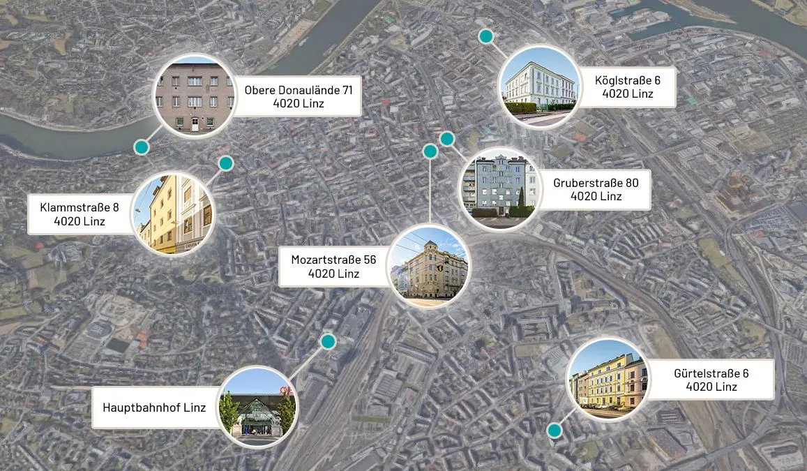 Nichts ist mehr wert als eine gute Lage. Alle Liegenschaften des Projekts befinden sich in der Innenstadt von Linz und sind weitgehend von zahlreichen Nahversorgungseinrichtungen wie Supermärkten, Gastronomien und Freizeiteinrichtungen umgeben. Die Standorte sind durch das vielfältige Angebot an Bus- und Straßenbahnlinien sehr gut an das öffentliche Verkehrsnetz ange-schlossen, wodurch sich das Stadtzentrum von Linz in wenigen Minuten erreichen lässt. Im Stadtgebiet verteilte Grünflächen und Naherholungsangebote wie der Stadtpark und die Donaupromenade befinden sich in Gehweite und laden zum Verweilen ein.