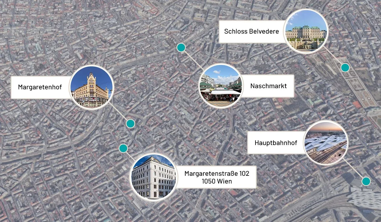 Nichts ist mehr wert als eine gute Lage. Das Projekt „Margaretenstraße 102“ befindet sich inmitten des 5. Wiener Gemeindebezirks Margareten. Geschäfte des täglichen Bedarfs, zahlreiche Restaurants und Cafés sowie kulturelle und öffentliche Einrichtungen wie Theater, Kinos, Schulen und Kindergärten liegen in unmittelbarer Nähe. Insbesondere der weltberühmte Wiener Naschmarkt ist innerhalb von 10 Fußminuten zu erreichen und bietet eine unendliche Vielfalt an Genüssen und Kulinarik. Über die U-Bahn-Linie U4 und Autobuslinie 13A ist der Standort ausgezeichnet an das öffentliche Verkehrsnetz angebunden und die Innenstadt innerhalb von 15 Minuten zu erreichen. Parkanlagen wie der Bacherpark und Scheupark sowie der Margaretenplatz mit seinem wöchentlichem Bauernmarkt befinden sich ebenso in Gehweite und laden zum Verweilen ein.