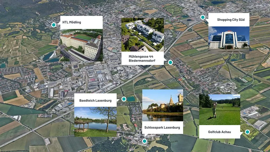 Die im begehrten Speckgürtel von Wien gelegene Marktgemeinde Biedermannsdorf, beherbergt sowohl ein vielfältiges Angebot an Freizeit- und Erholungsgebieten sowie auch diverse Nahversorger für den täglichen Bedarf. Für einen Einkaufsausflug erreicht man das größte Einkaufszentrum Österreichs, die Shopping City Süd oder auch SCS genannt, in wenigen Minuten mit dem Auto. Durch die von der Mühlengasse gut erreichbare Anbindung zum Bahnhof Laxenburg-Biedermannsdorf, erreicht man in rund 30 Minuten den Hauptbahnhof Wien und mit dem Auto die Stadtgrenze in nur 10-15 Minuten.