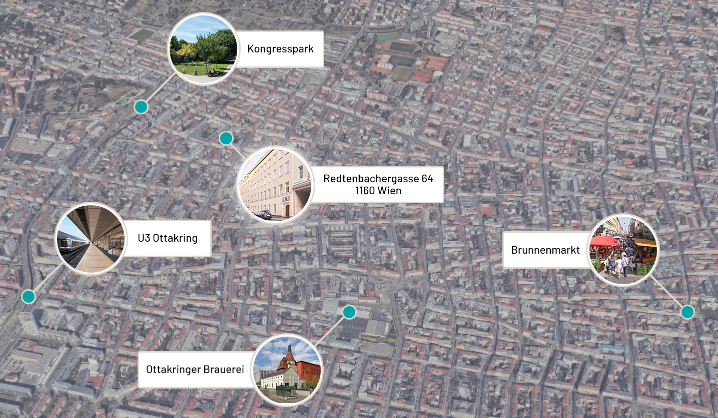 Nichts ist mehr wert als eine gute Lage. Das Projekt „Redtenbachergasse 64“ liegt inmitten des 16. Wiener Gemeindebezirks. In unmittelbarer Nähe liegen zahlreiche Nahversorgungseinrichtungen wie Supermärkte, Fachmarktzentren und Gastronomien. Durch die direkte Nähe zum Bahnhof Wien Hernals sowie zu relevanten Straßenbahnlinien ist das Stadtzentrum Wien mit den öffentlichen Verkehrsmitteln gut zu erreichen. Grünflächen wie der Kongresspark befinden sich in Gehweite und laden zum Verweilen ein.