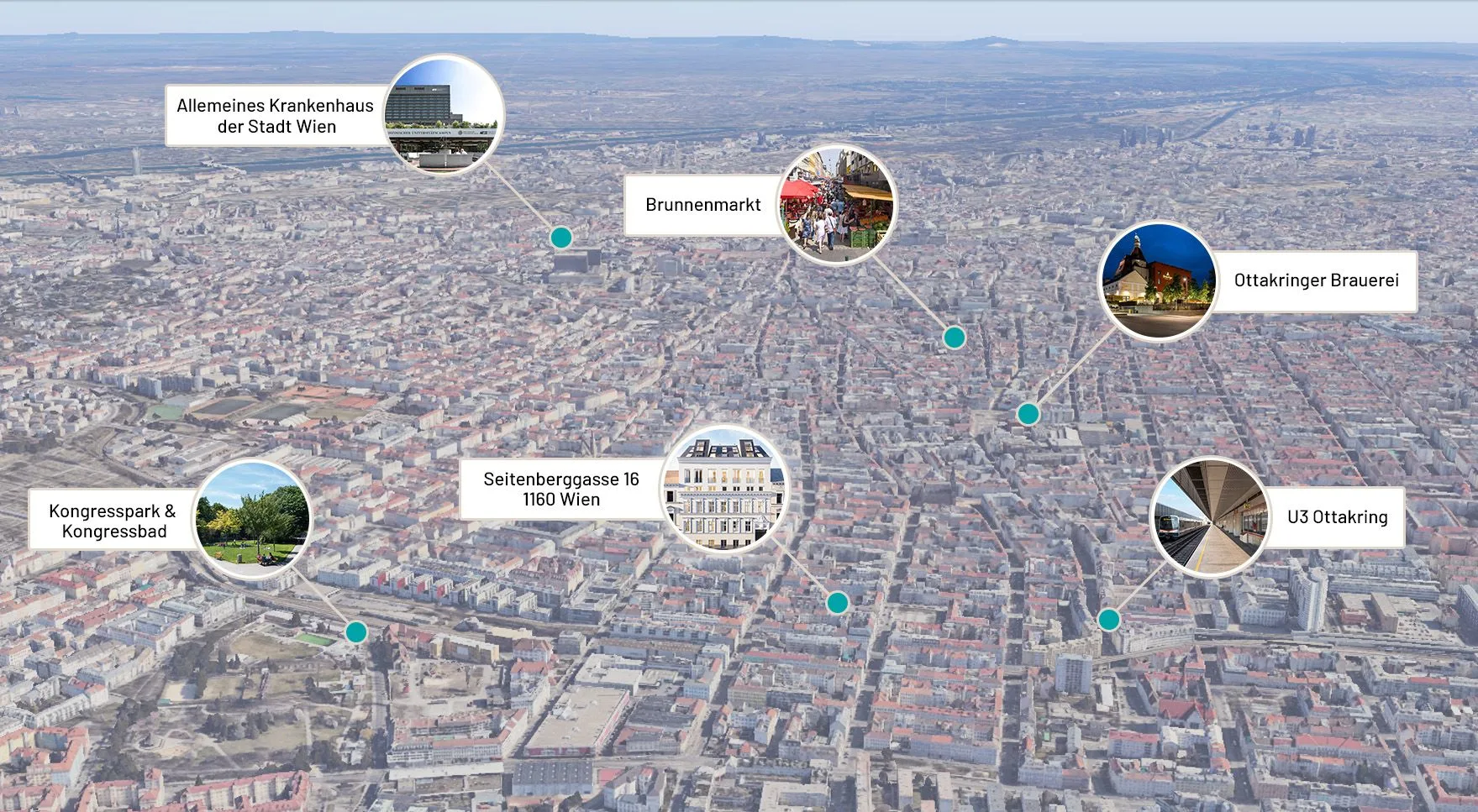 Nichts ist mehr wert als eine gute Lage. Das Projekt „Seitenberggasse 16“ liegt inmitten des 16. Wiener Gemeindebezirks. In unmittelbarer Nähe liegen jegliche Nahversorgungseinrichtungen aller Art. In nur 15 Minuten ist die Klinik Ottakring, fußläufig zu erreichen. Der Friedhof Wien Ottakring liegt ebenfalls in nächster Nähe im Westen des Bezirks Ottakring. Die Lugner City bietet einen idealen Ort für ein ausgewogenes Shoppingerlebnis.
