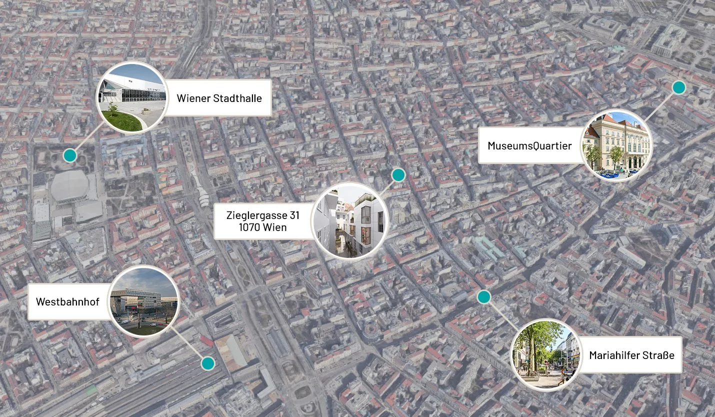 Nichts ist mehr wert als eine gute Lage. Das Projekt „Zieglergasse 31“ befindet sich inmitten des 7. Wiener Gemeindebezirks Neubau im Bezirksteil Schottenfeld. In unmittelbarer Nähe liegen zahlreiche Nahversorgungseinrichtungen wie Supermärkte, Gastronomien sowie bekannte Kultur- und Freizeiteinrichtungen. Innerhalb von wenigen Fußminuten gelangt man zur gleichnamigen U3-Station Zieglergasse sowie relevanten Straßenbahn- und Buslinien, wodurch der Standort ausgezeichnet an das öffentliche Verkehrsnetz angebunden ist. Zahlreiche Galerien, hippe Designerläden und trendige Restaurants in der direkten Nachbarschaft laden zum Entdecken und Verweilen ein.