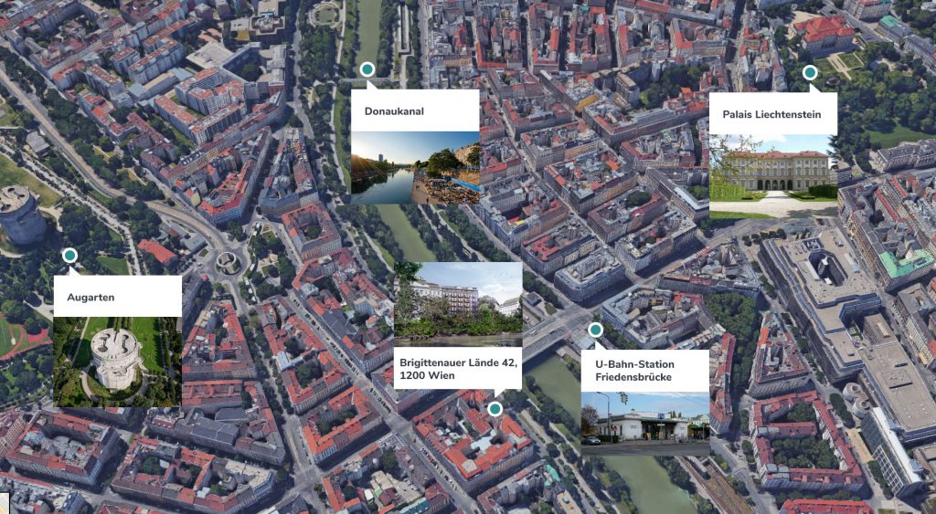 Das Haus Brigittenauerlände 42 liegt direkt am Kanal, einige Schritte von der Friedensbrücke entfernt, die das Grätzel mit dem 9. Bezirk verbindet. Dort befindet sich auch eine Station der U4. Das Ufer des Donaukanals ist ideal für den Morgen- oder Abendsport geeignet. Radfahrer und Jogger erfreuen sich vieler ebener Kilometer entlang des Wassers.