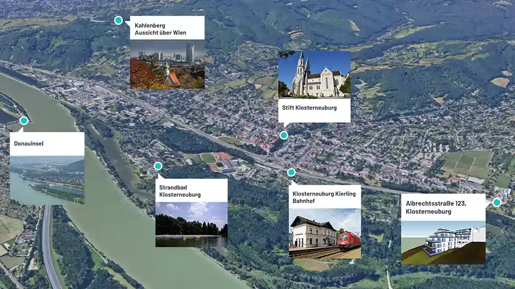 Klosterneuburg combines the best of two worlds: on the one hand the immediate vicinity of the metropolis of Vienna and on the other hand the local mountains with the extensive Vienna Woods as a local recreation area. Thanks to the direct connection via heated driveway to Klosterneuburger Straße, which leads directly to Vienna, Vienna can be reached by car within a few minutes. Also by public train you can reach the city centre of Vienna within 20 minutes.