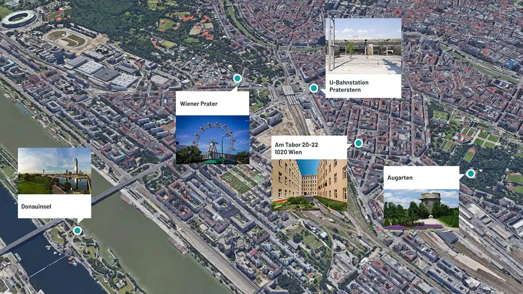 Nothing is worth more than a good location. The project "Am Tabor 20-22" is located in the immediate vicinity of the two underground stations Praterstern and Taborstraße, which means that the city centre can be reached in just under 10 minutes. The two extensive local recreation areas Augarten and the Vienna Prater offer countless possibilities to escape the hustle and bustle of the city. Especially the Jesuit meadow in the Prater attracts many people, as this former floodplain invites to relax. Also in the 9km² large Prater area is the Würstelprater, which is popular with young and old alike, with countless attractions and rides.