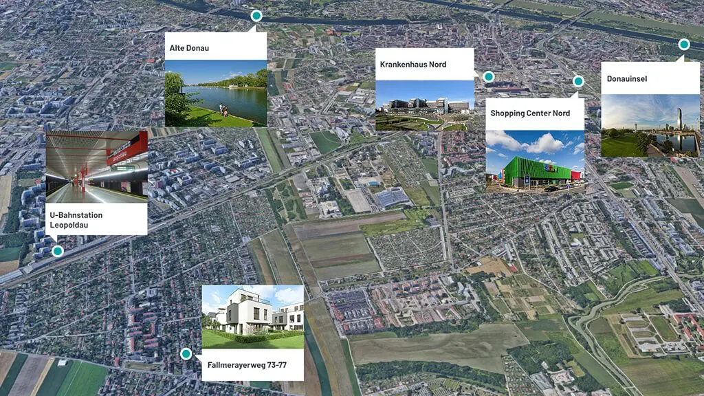The Fallmerayerweg 73-77 is located at the edge of the 21st district of Floridsdorf, Vienna. The subway station Leopoldau, which can be reached in a few minutes on foot with the subway line U1, connects the residents with the inner city of Vienna as well as with popular local recreation areas such as the Alte Donau or the Donaupark. Thanks to its location in a residential area, all the amenities of daily life can be reached quickly, which means that at this location one can enjoy both recreation through green spaces and local recreation areas and the advantages of a quiet district with extensive social, educational, cultural and sports facilities as well as various possibilities for local supply. Local suppliers are also in the immediate vicinity: supermarkets, pharmacies and banks can be reached in just a few minutes. By car or bus, you can reach SCN with a variety of shops in just a few minutes.