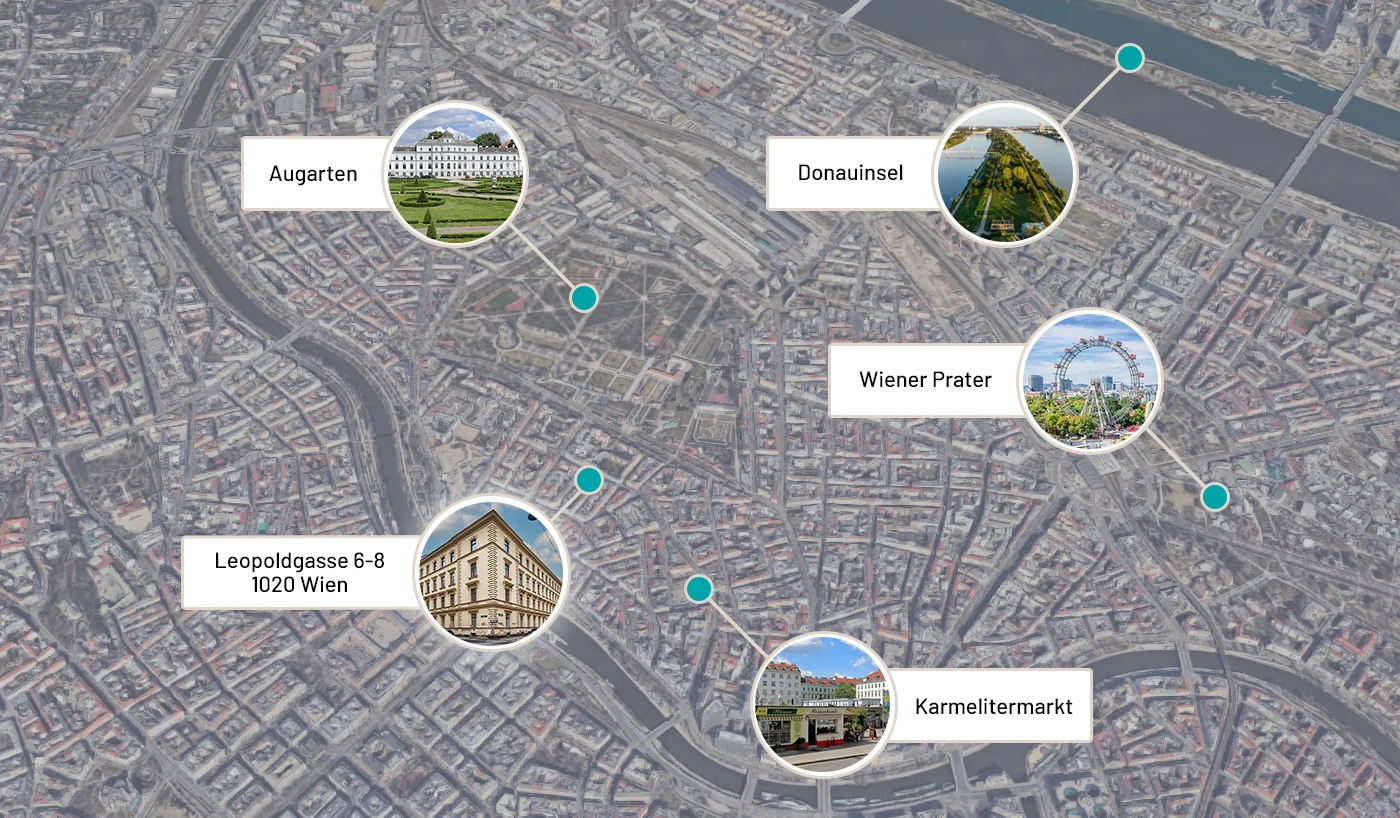 Vienna's 2nd district, Leopoldstadt, has been experiencing a massive upswing for several years, which has been noticeable in many ways: from an economic point of view, a very successful settlement of well-known companies such as Bank Austria, SAP, Samsung, Raiffeisen Bank or OMV has been achieved. In the immediate vicinity, the office location Austria Campus was recently opened, which serves, among other things, as the headquarters for the Vienna Chamber of Commerce and the headquarters of Bank Austria. This increased demand for qualified workers is also increasingly met by the higher educational institutions in the middle of Leopoldstadt. Vienna's 2nd district is characterized above all by its diverse range of local recreation, cultural, educational and leisure facilities.