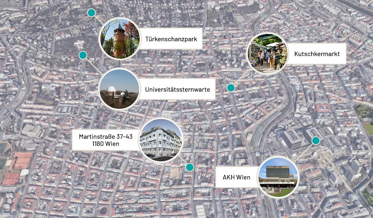 Where urban market feeling and dignified lifestyle meet - this aptly describes the district and thus the eponymous location of the "Martinstrasse 37-43" project. With a multitude of old buildings and well-kept parks, Währing offers its residents a pleasant lifestyle. Educational institutions such as the renowned Wasagasse High School and the Vienna University of Teacher Education characterize the district's educational offerings. The good infrastructure with a variety of shopping facilities, restaurants and cafés makes life in Währing comfortable and convenient. Those interested in culture can discover and enjoy galleries, theaters and event venues in Währing. In addition, local recreation areas such as Türkenschanzpark and Pötzleinsdorfer Schlosspark are popular places to relax and enjoy the beauty of nature.